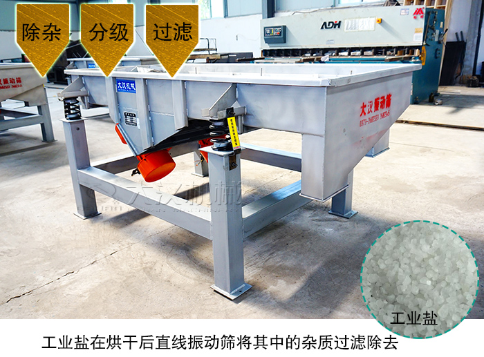 工業(yè)鹽在烘干后需要經(jīng)過皮帶輸送機(jī)輸送到料倉中等待包裝出庫,然而在皮帶機(jī)輸送料倉的過程中,很有可能會(huì)產(chǎn)生結(jié)塊或者有異物落入工業(yè)鹽中,因此需要使用直線振動(dòng)篩將其中的雜質(zhì)過濾除去。