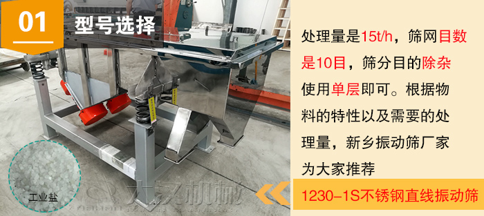 下面小編從型號(hào)選擇、方案設(shè)計(jì)、篩機(jī)材質(zhì)這三個(gè)方面給大家介紹一下篩分工業(yè)鹽用直線振動(dòng)篩好在哪里?希望這個(gè)簡單的技術(shù)分享便于各位需要工業(yè)鹽篩分用戶參考:
