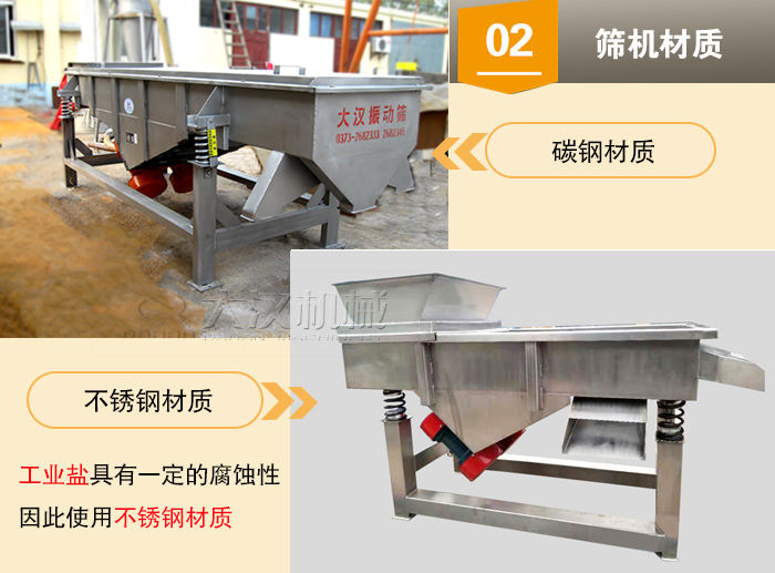 【篩機(jī)材質(zhì)】——常用的直線振動(dòng)篩有不銹鋼和碳鋼兩種材質(zhì),因?yàn)楣I(yè)鹽具有一定的腐蝕性,因此使用不銹鋼材質(zhì),使用時(shí)間更長,對(duì)物料也具有保護(hù)作用。