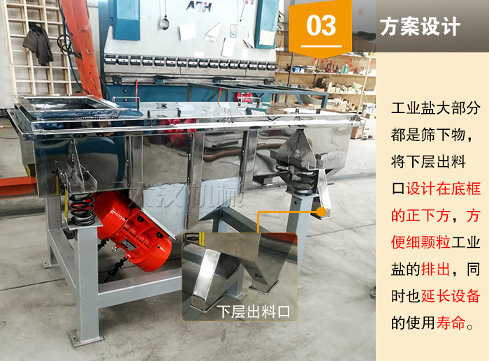 【方案設(shè)計(jì)】——工業(yè)鹽大部分都是篩下物,因此要對(duì)直線振動(dòng)篩的下出料口進(jìn)行改造,將下層出料口設(shè)計(jì)在底框的正下方,方便細(xì)顆粒工業(yè)鹽的排出,同時(shí)也延長設(shè)備的使用壽命。