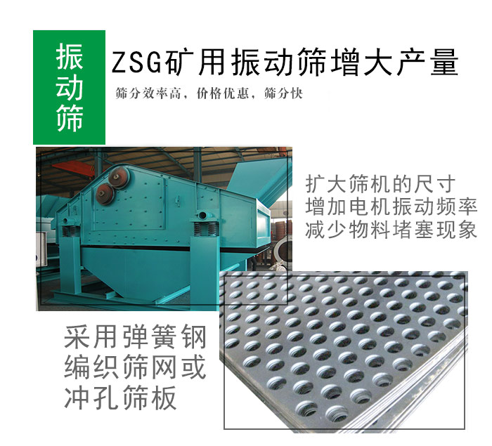 擴大篩機的尺寸、增加電機振動頻率,采用彈簧鋼編織篩網(wǎng)或沖孔篩板,使篩箱振動強烈,減少物料堵塞篩孔現(xiàn)象的同時使篩機具有較高的篩分效率和生產(chǎn)率,這樣就增加了zsg礦用重型振動篩增大產(chǎn)量。