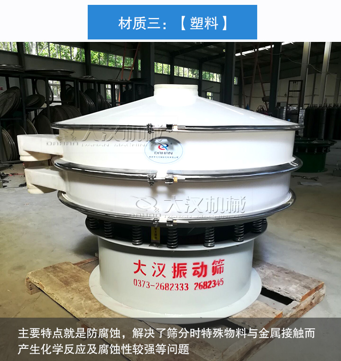 塑料振動(dòng)篩的結(jié)構(gòu)主要是【塑料+碳鋼(與物料接觸部分為塑料)】它主要特點(diǎn)就是防腐蝕,解決了篩分時(shí)特殊物料與金屬接觸而產(chǎn)生化學(xué)反應(yīng)及腐蝕性較強(qiáng)等問題。接觸物料部位從篩框、篩網(wǎng)、中框、密封蓋和清網(wǎng)裝置等完全采用非金屬材料,完全排除了一些特殊物料與金屬接觸會(huì)產(chǎn)生化學(xué)反應(yīng)等問題。塑料振動(dòng)篩適用于化工、醫(yī)藥、軍工等特種行業(yè)干粉或漿液類物料篩分過濾作業(yè)。