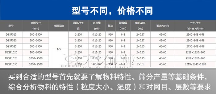 想要購(gòu)買到合適的型號(hào)首先就要了解物料特性、篩分產(chǎn)量等基礎(chǔ)條件,綜合分析物料的特性(粒度大小、濕度)和對(duì)網(wǎng)目、層數(shù)等要求。要綜合考慮材質(zhì)、生產(chǎn)場(chǎng)地等條件。同時(shí)我們公司可以根據(jù)您的產(chǎn)量等要求為您推薦型號(hào)(DZSF-515、DZSF-520、DZSF-530、DZSF-1020、DZSF-1030、DZSF-1540等),同時(shí)大漢公司還支持設(shè)備特殊定做,為您定制專屬的篩分設(shè)備。
