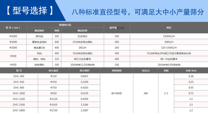 【型號選擇】—— DHC系列超聲波振動篩型號有:DHC-400、DHC-600、DHC-800、DHC-1000、DHC-1200、DHC-1500、DHC-1800、DHC-2000等八種標(biāo)準(zhǔn)直徑型號,可滿足100目—600目的細(xì)網(wǎng)篩分,每小時500KG—3000KG的大中小產(chǎn)量篩分。