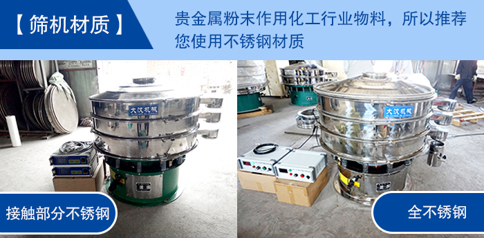 【篩機(jī)材質(zhì)】—— 貴金屬粉末作用化工行業(yè)物料,所以推薦您使用不銹鋼材質(zhì),而常用的不銹鋼超聲波振動篩分為兩種結(jié)構(gòu),一種是整機(jī)均采用不銹鋼制成,另一種是與物料接觸不分為不銹鋼材質(zhì),底座為碳鋼材質(zhì),至于如何選擇就看您對衛(wèi)生環(huán)境的要求以及成本預(yù)算了。